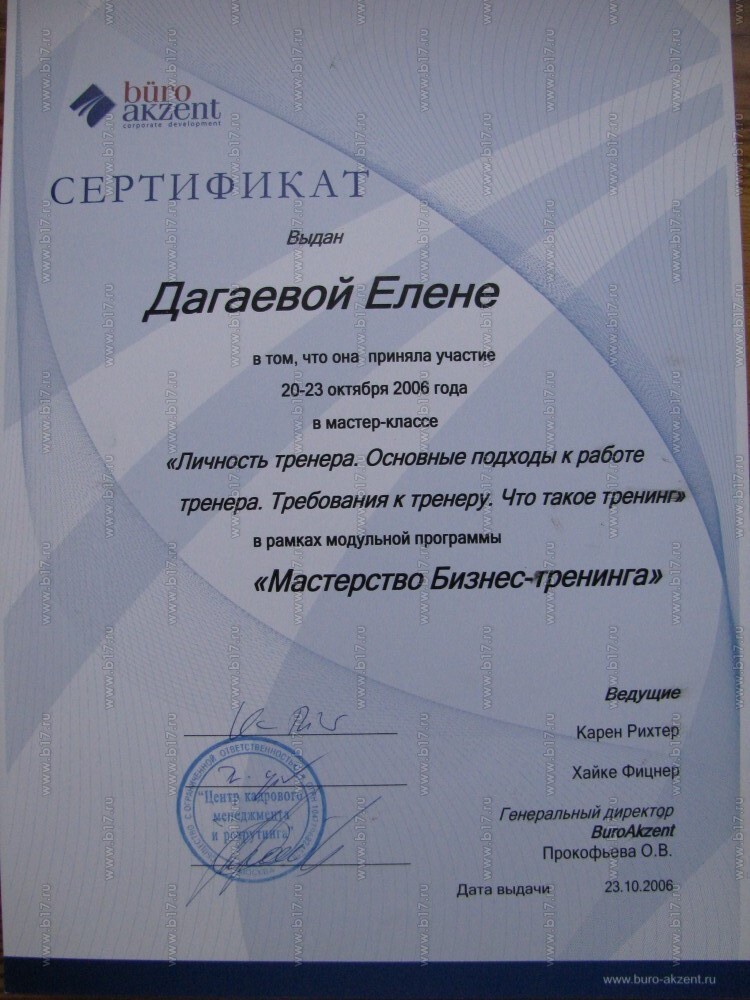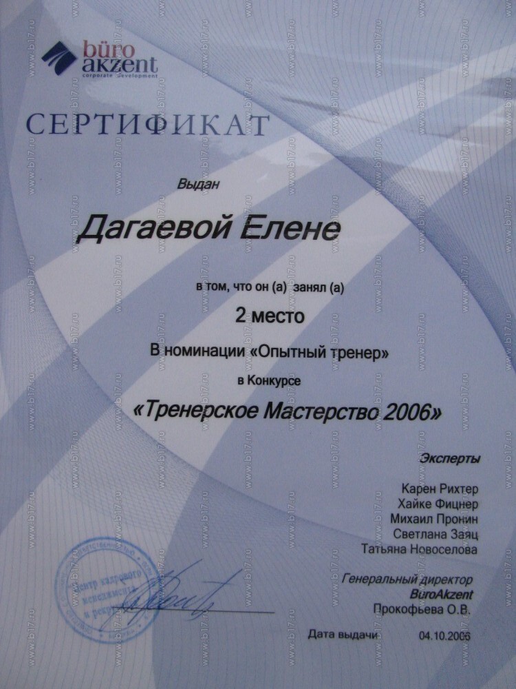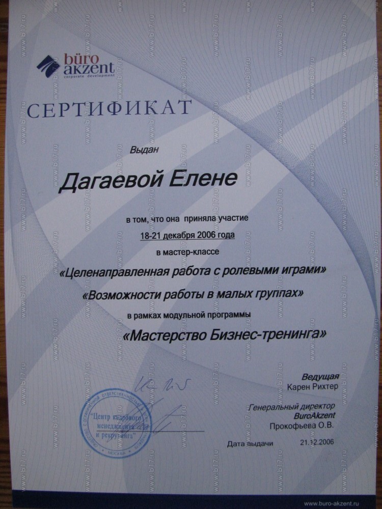 2006 г. – Обучение на бизнес-тренера, Бюро-акцент (Москва).