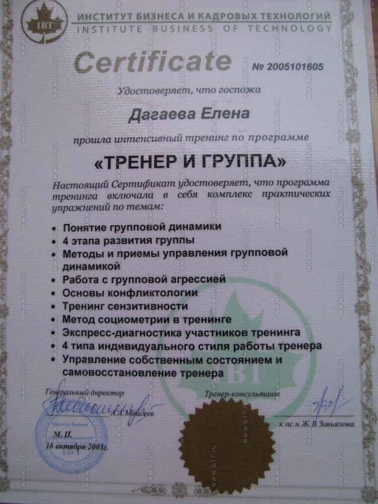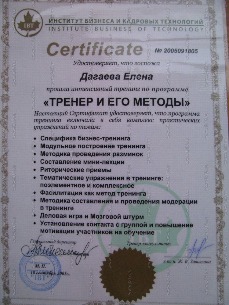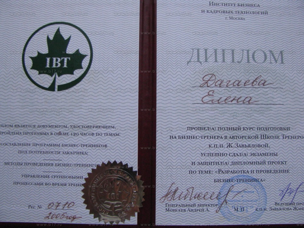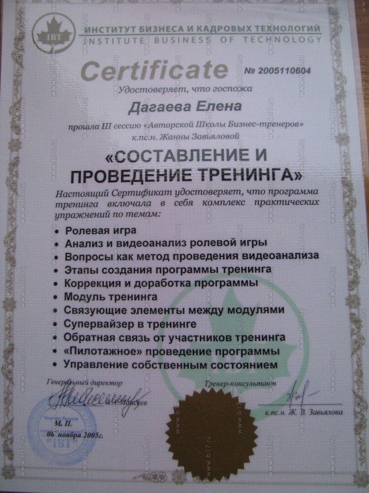 2005 г. – Обучение на бизнес-тренера, Школа бизнес-тренеров Жанны Завьяловой (Москва).
