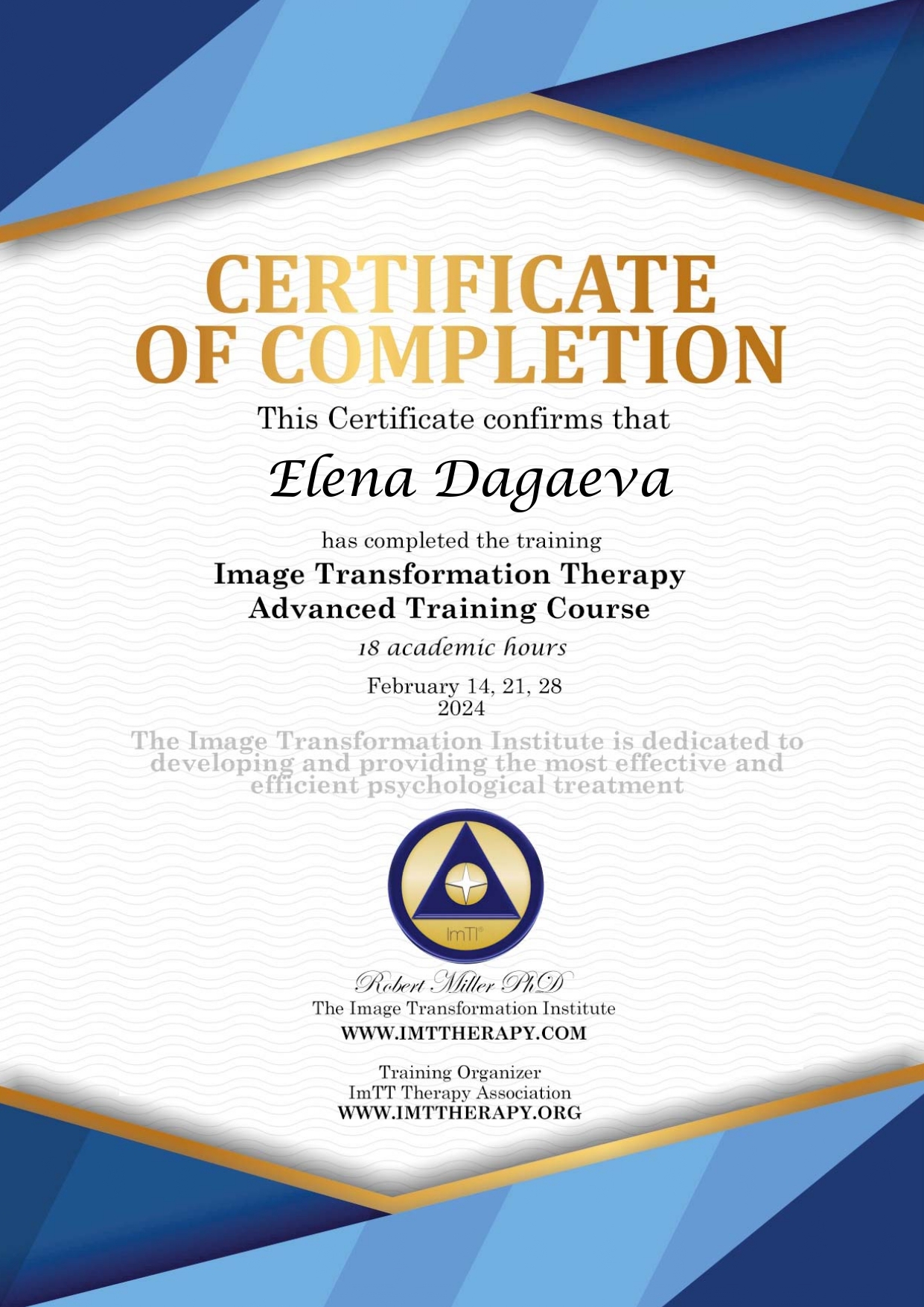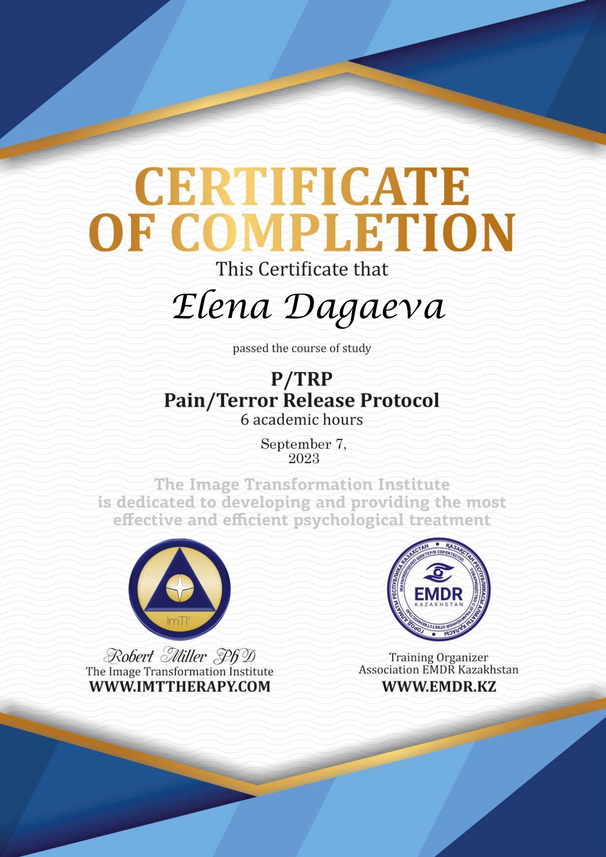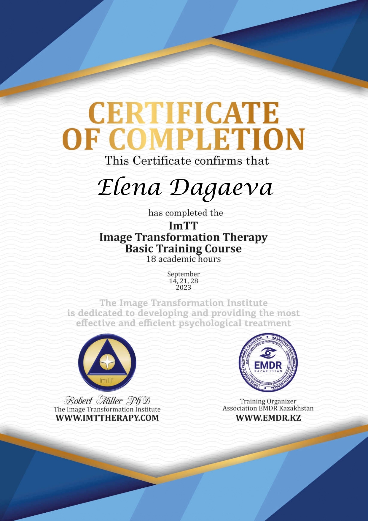 2024 г. – Терапия трансформацией образа (ImTT), продвинутый курс Ассоциация EMDR Kazahstan, ведущий – Роберт Миллер (США).