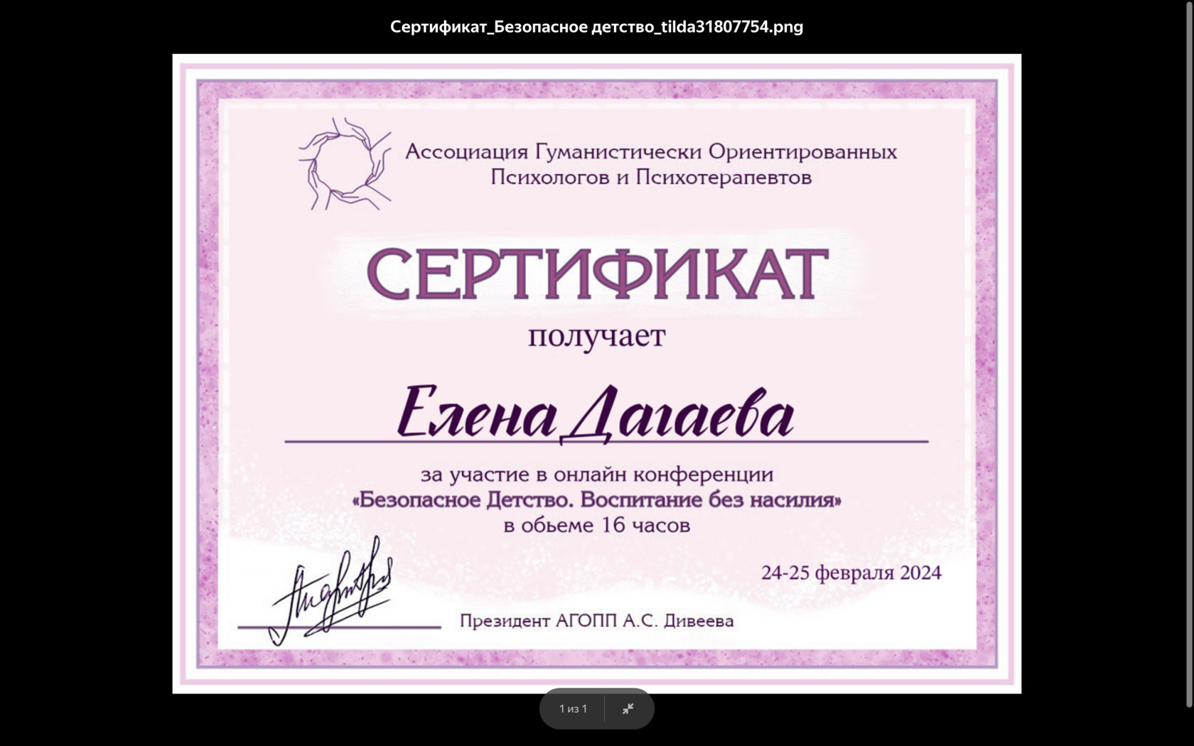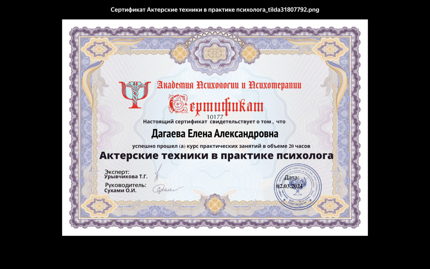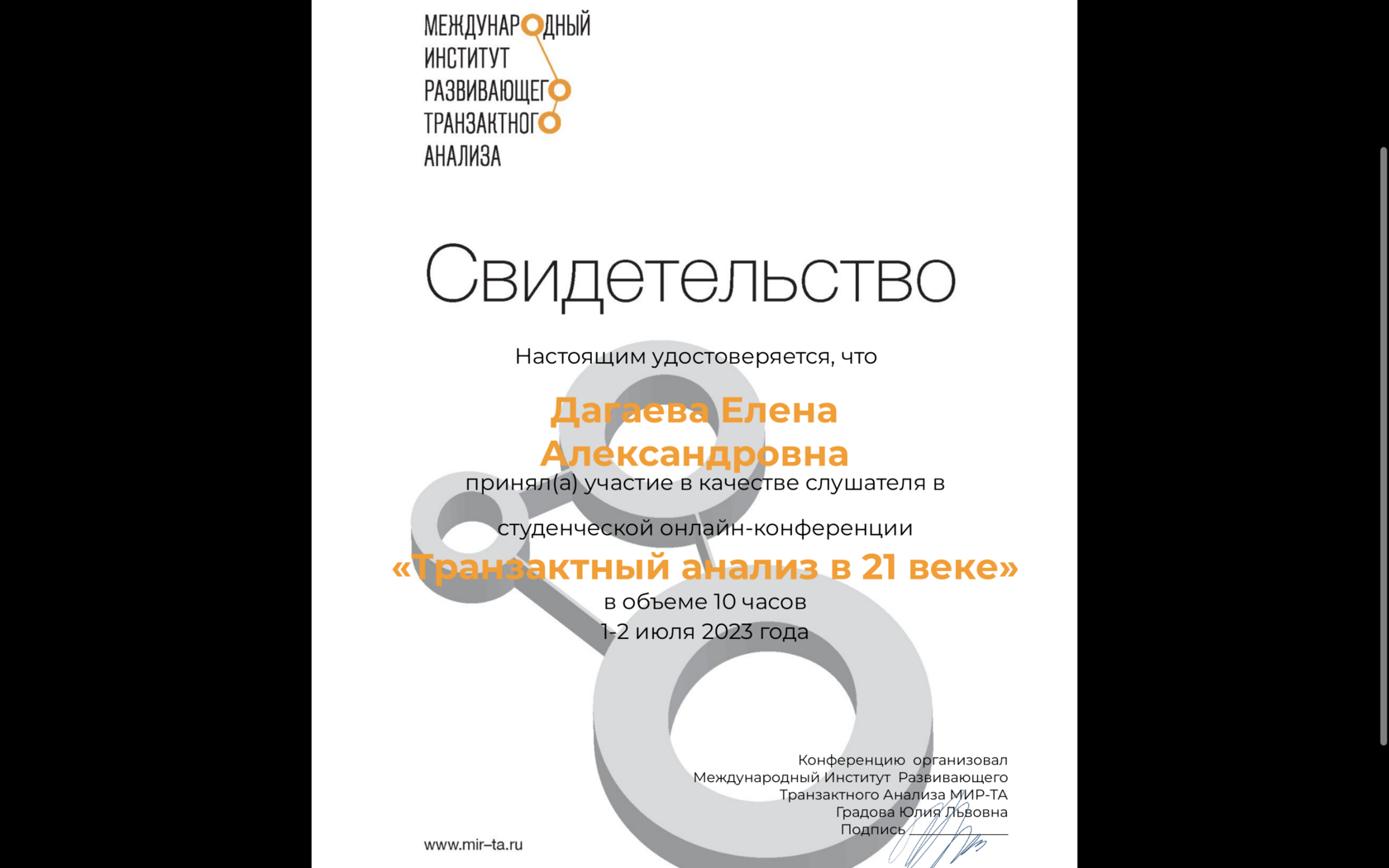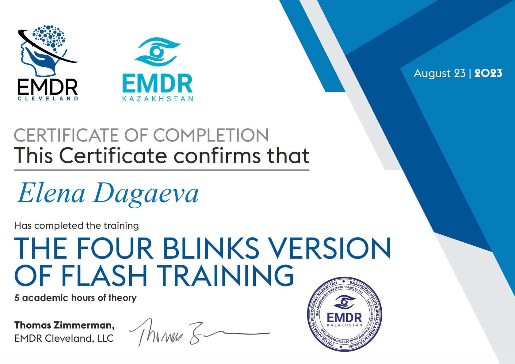 2024 г. – Терапия трансформацией образа (ImTT), продвинутый курс Ассоциация EMDR Kazahstan, ведущий – Роберт Миллер (США).