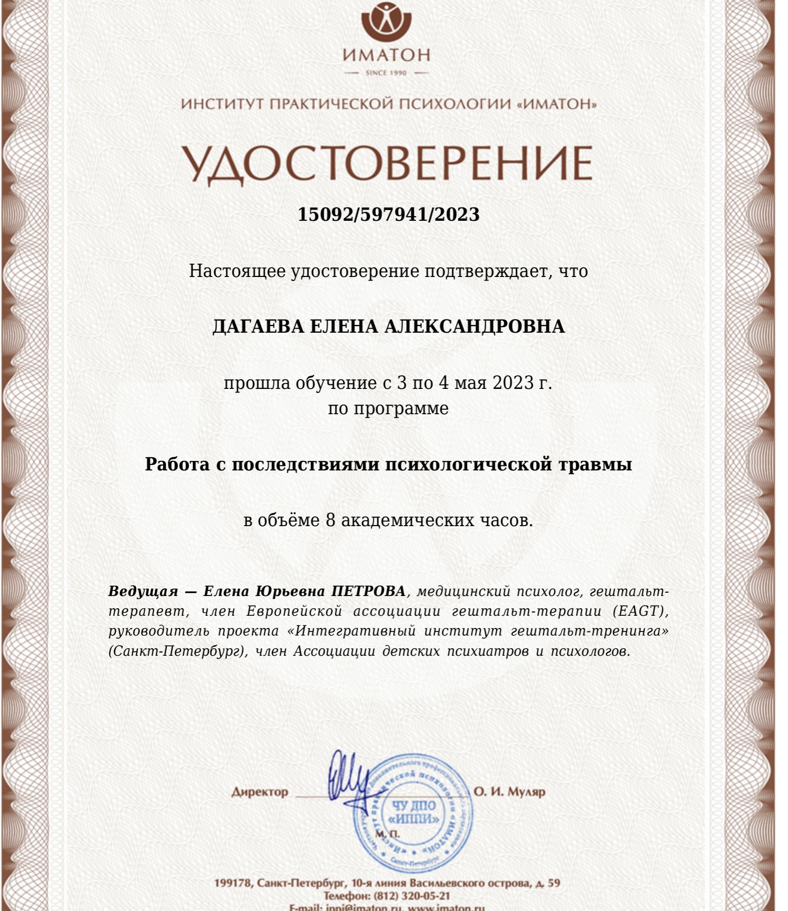 2023 г. – Работа с последствиями психологической травмы. Институт практической психологии «Иматон», ведущая – Е. Ю. Петрова, (Санкт-Петербург).