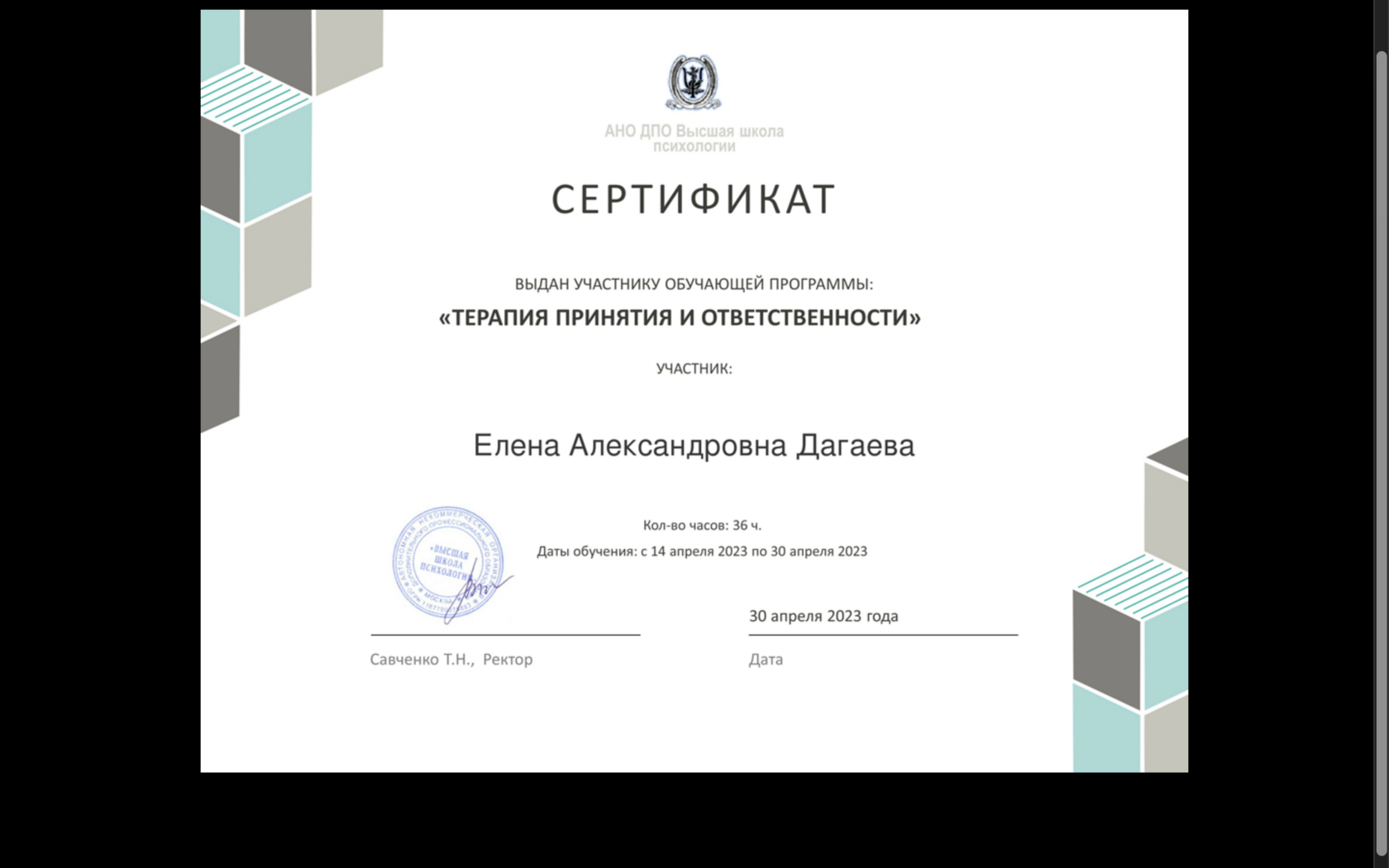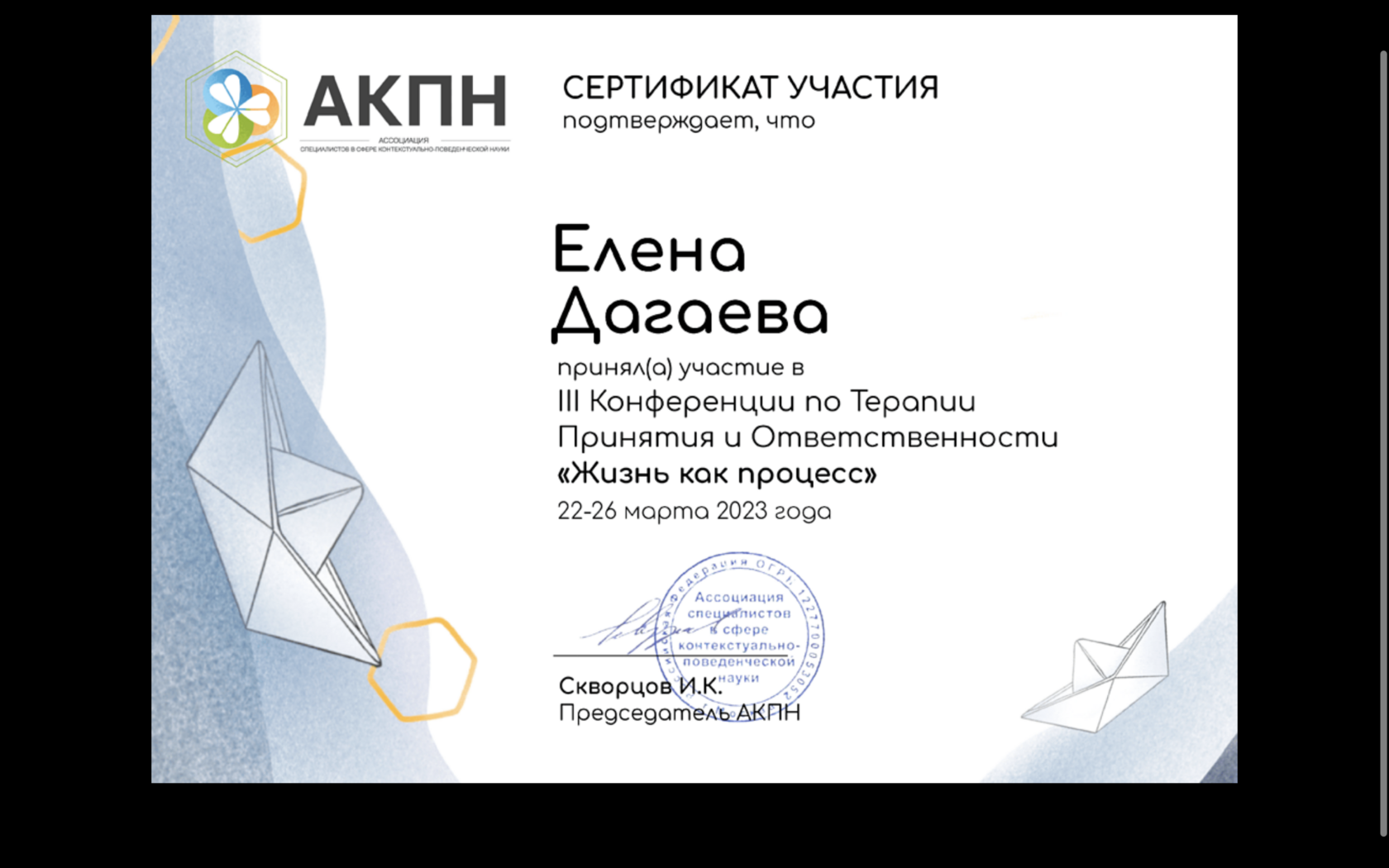 2023 г. – Терапия принятия и ответственности. АНО ДПО «Высшая школа психологии», ведущие – Н. Прилепский, О. Викторова (Москва).