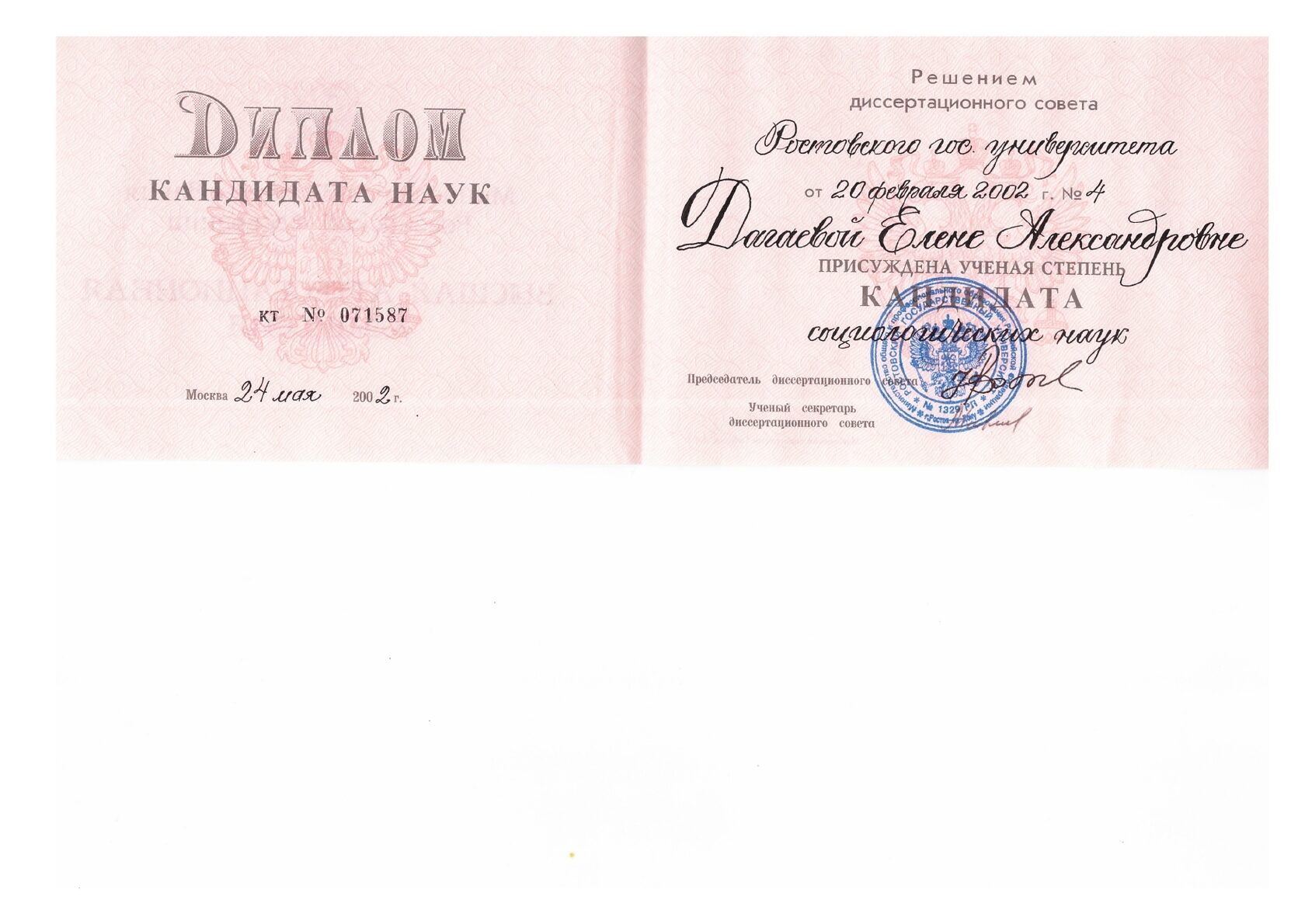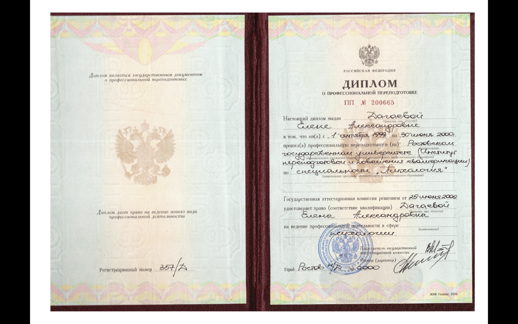 2000 г. – ДПО "Психология", Ростовский государственный университет (РГУ, ныне - ЮФУ) (Ростов-на-Дону).