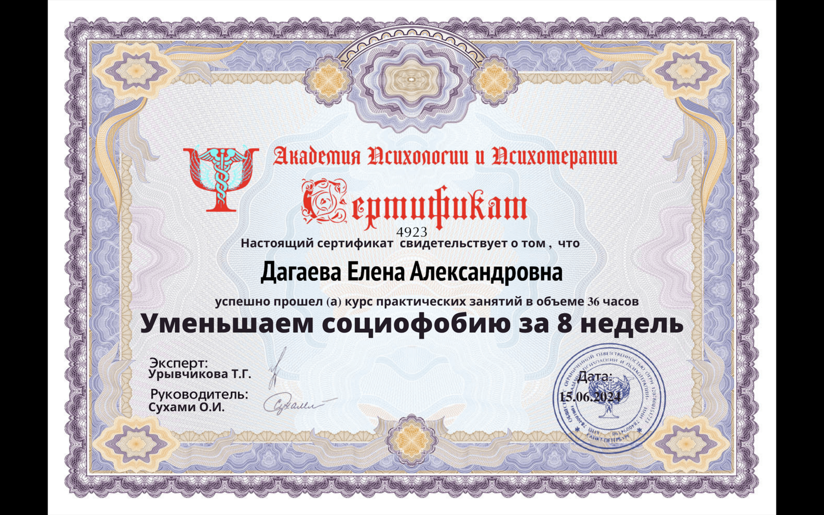 2024 г. – Уменьшаем социофобию за 8 недель, Академия психологии и психотерапии, ведущая – Татьяна Урывчикова (Москва).