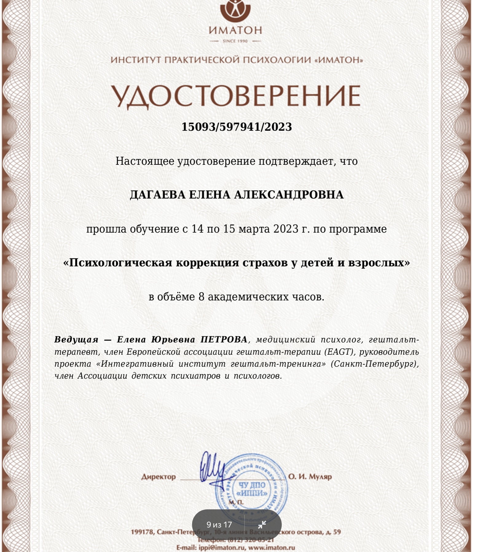 2023 г. – Психологическая коррекция страхов у детей и взрослых. Институт практической психологии «Иматон», ведущая – Е. Ю. Петрова, (Санкт-Петербург).