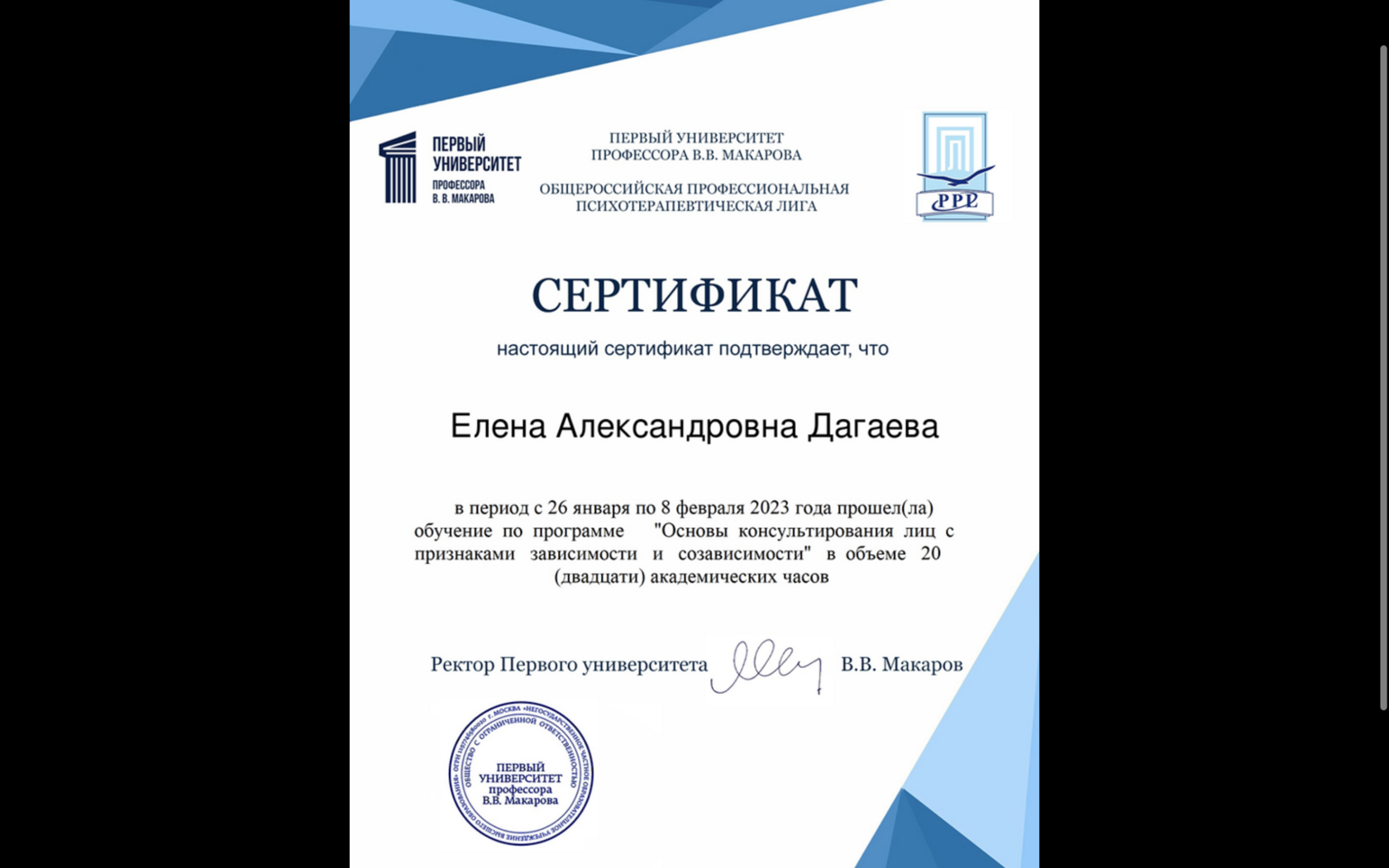 2023 г. – Основы консультирования лиц с признаками зависимости и созависимости. Ведущий – А. Л. Катков. Первый университет проф. В. В. Макарова, (Москва).