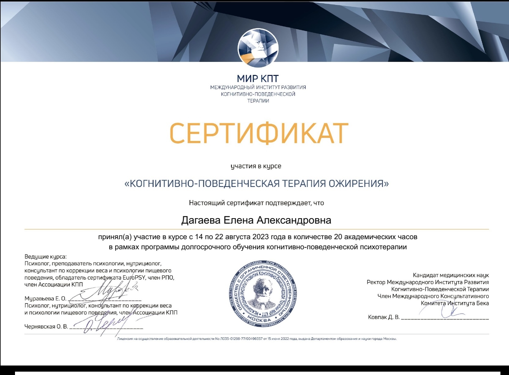 2023 г. – Когнитивно-поведенческая терапия ожирения. Ассоциация когнитивно-поведенческой терапии. Ведущие – Е. О. Муравьева, О. В. Чернявская, (Москва).