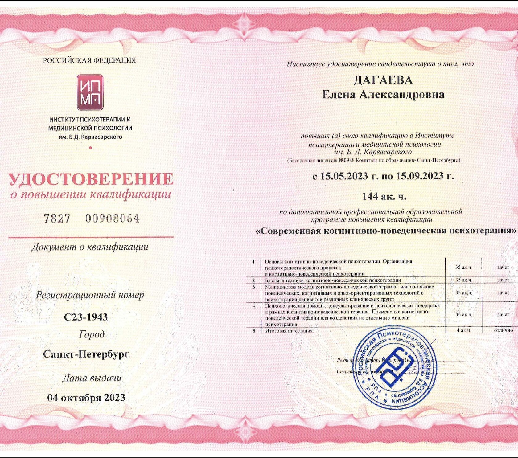 2023 г. – Современная когнитивно-поведенческая терапия. Санкт-Петербургский институт медицинской психологии и психотерапии им. Карвасарского. Ведущая – И. В. Бубнова. (Санкт-Петербург)