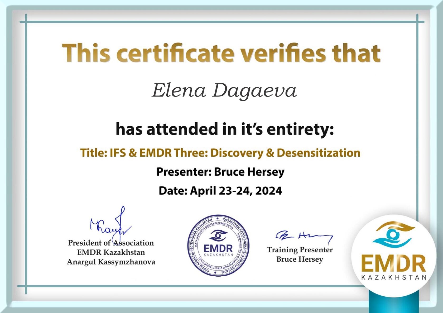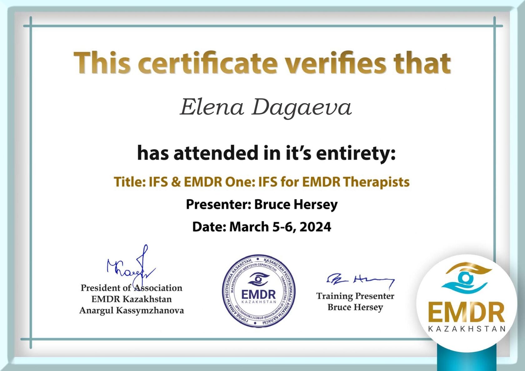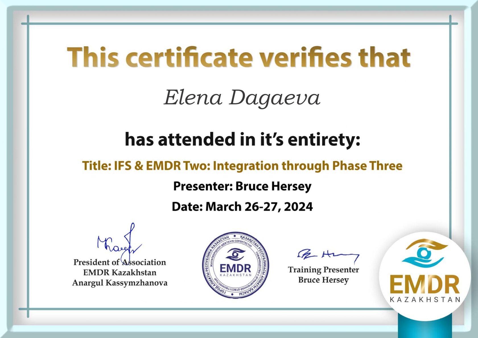 2024 г. – IFS & EMDR: IFS for EMDR terapists, Ассоциация EMDR Kazahstan, ведущий Брюс Херси (США).