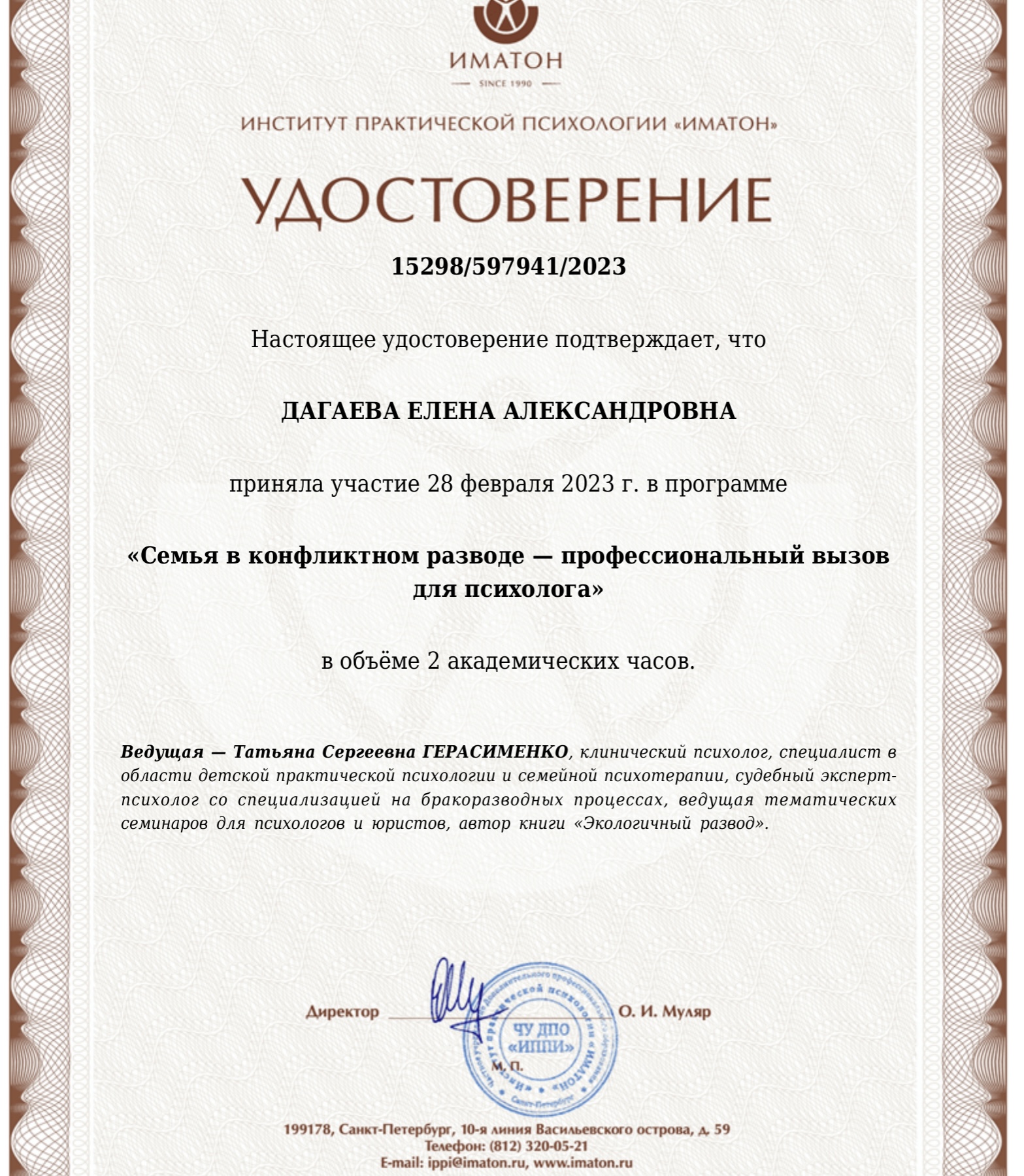 2023 г. – Семья в конфликтном разводе – профессиональный вызов для психолога. Институт практической психологии «Иматон», ведущая – Т. С. Герасименко, (Санкт-Петербург).