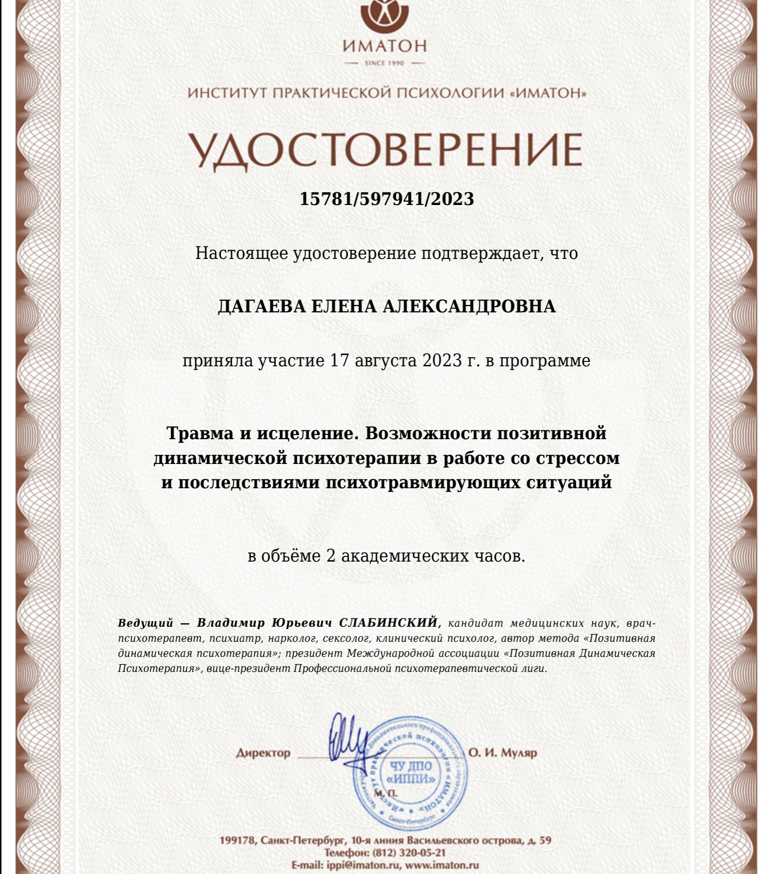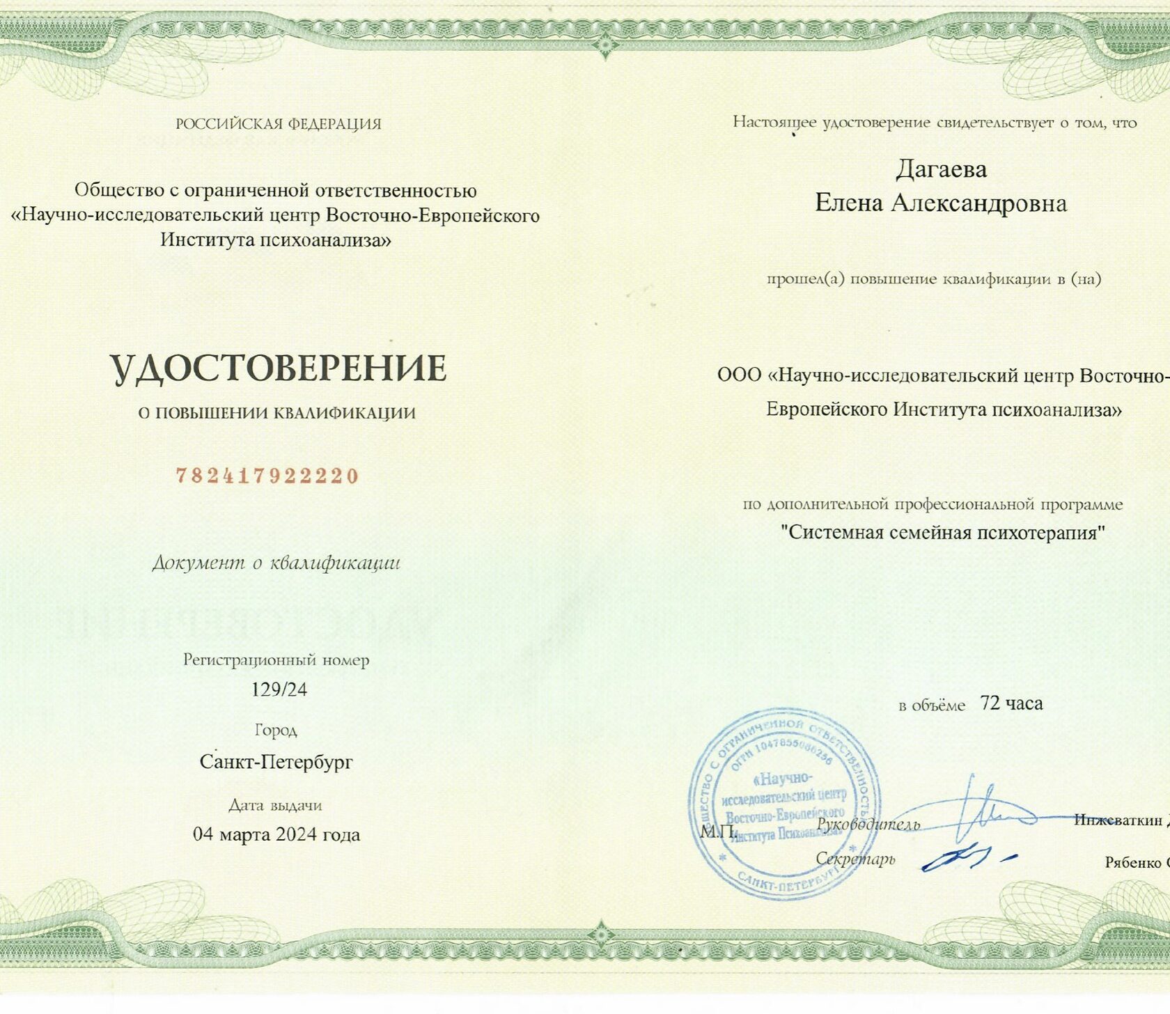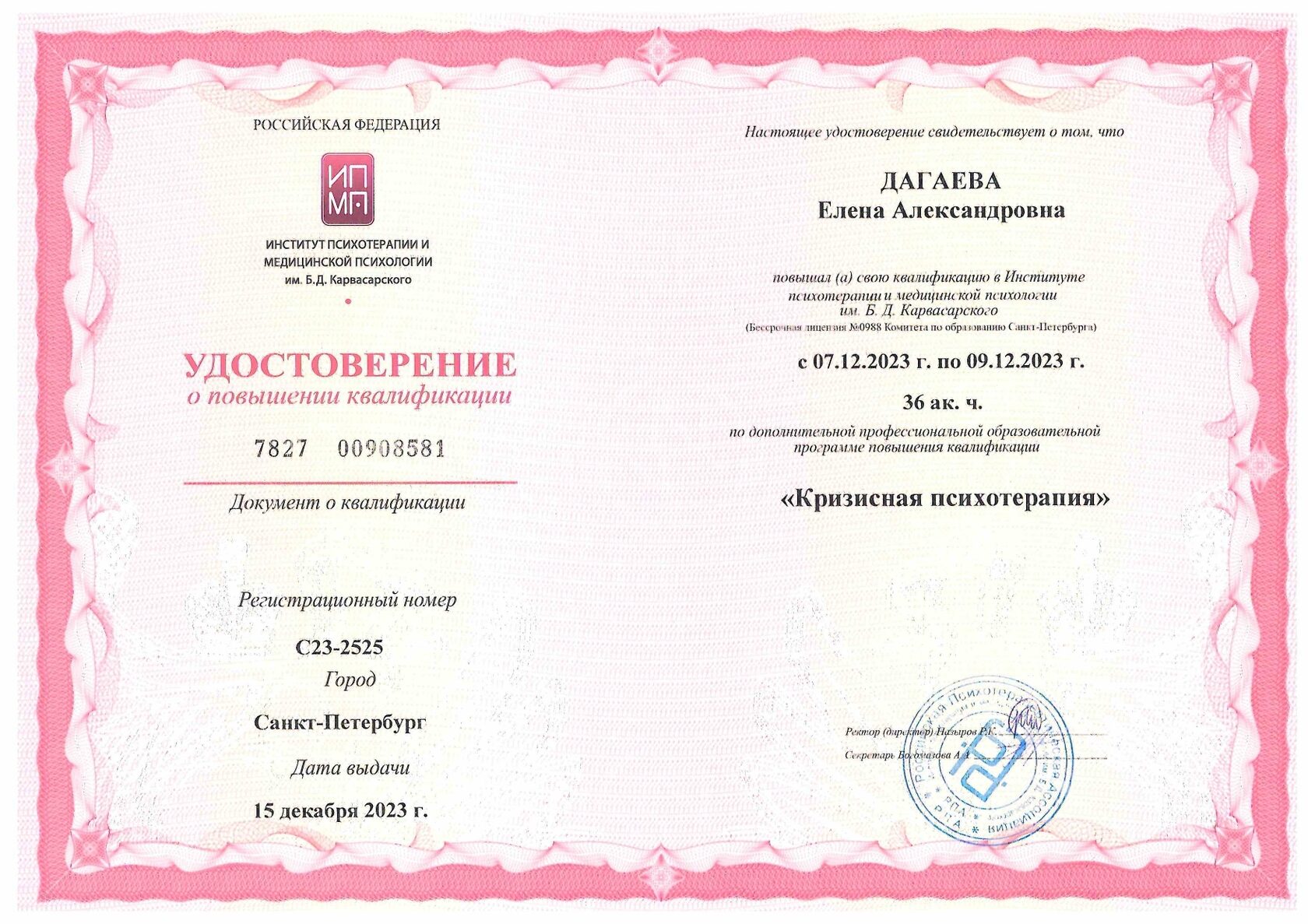 2024 г. – Кризисная психотерапия, Санкт-Петербургский институт медицинской психологии и психотерапии им. Карвасарского, (Санкт-Петербург).