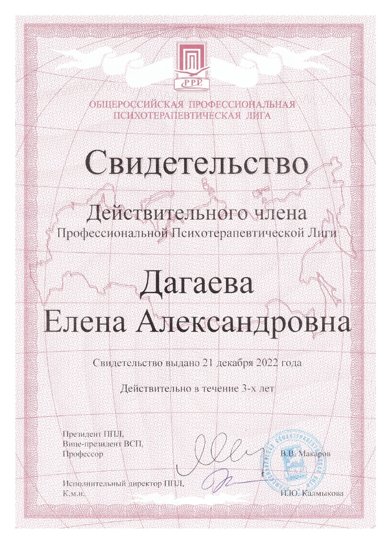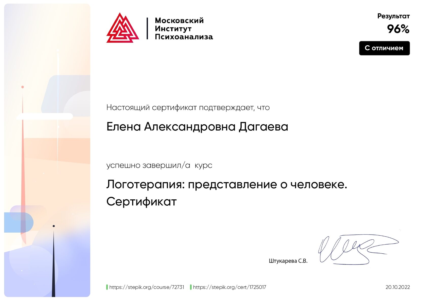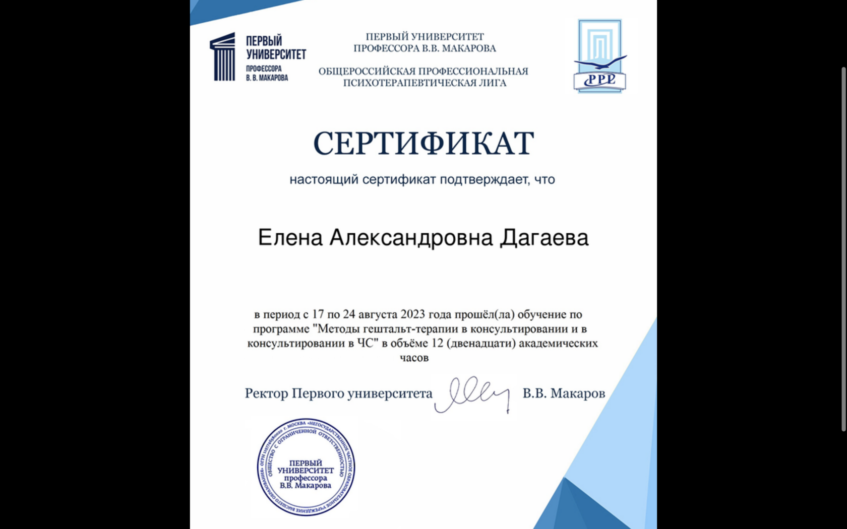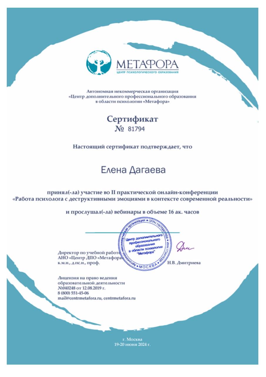 2024 г. – Кризисная психотерапия, Санкт-Петербургский институт медицинской психологии и психотерапии им. Карвасарского, (Санкт-Петербург).