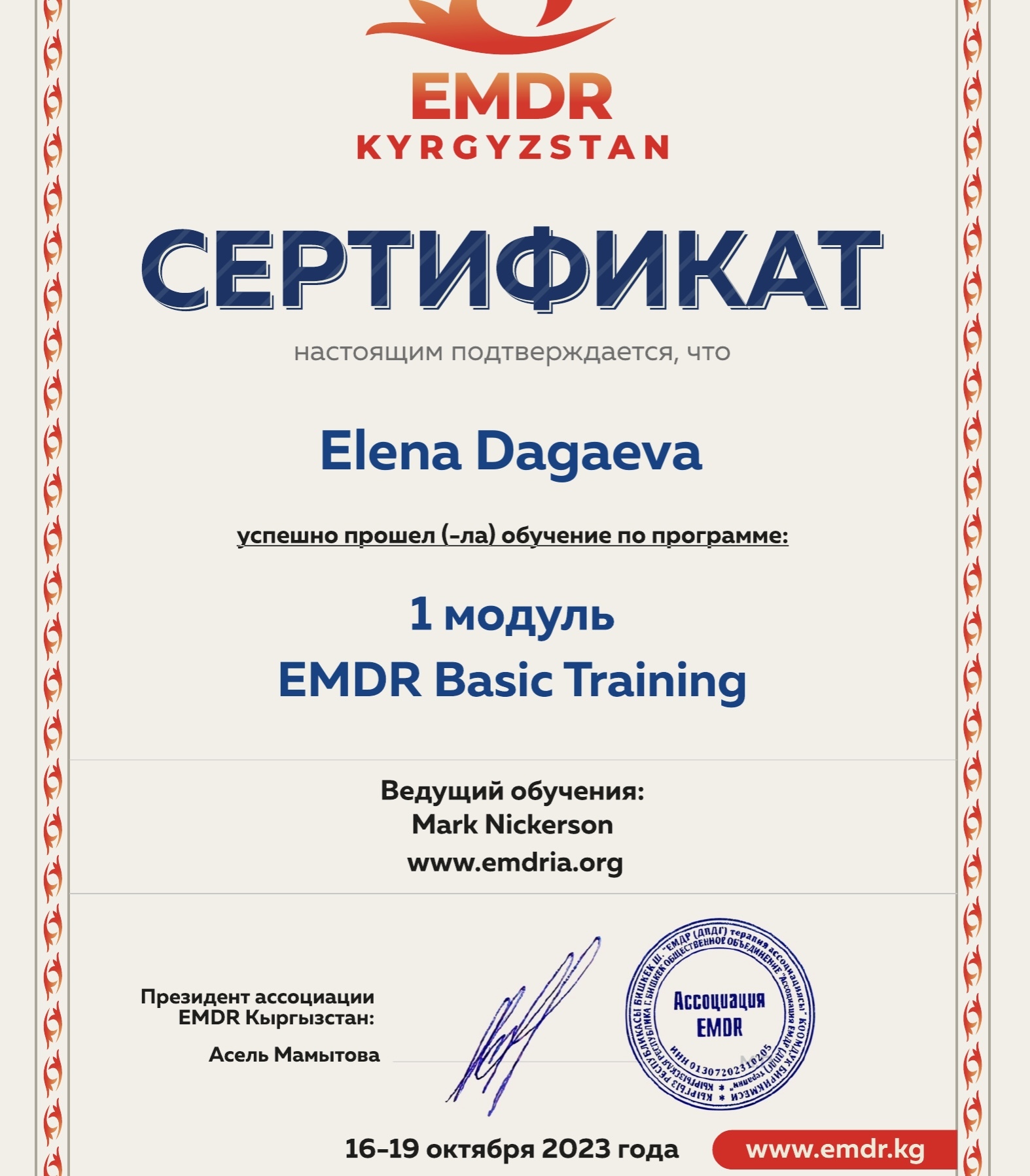 2023 – 2024 гг. – EMDR базовый тренинг, Ассоциация EMDR Кыргызстана, ведущий – Марк Никерсон (США).