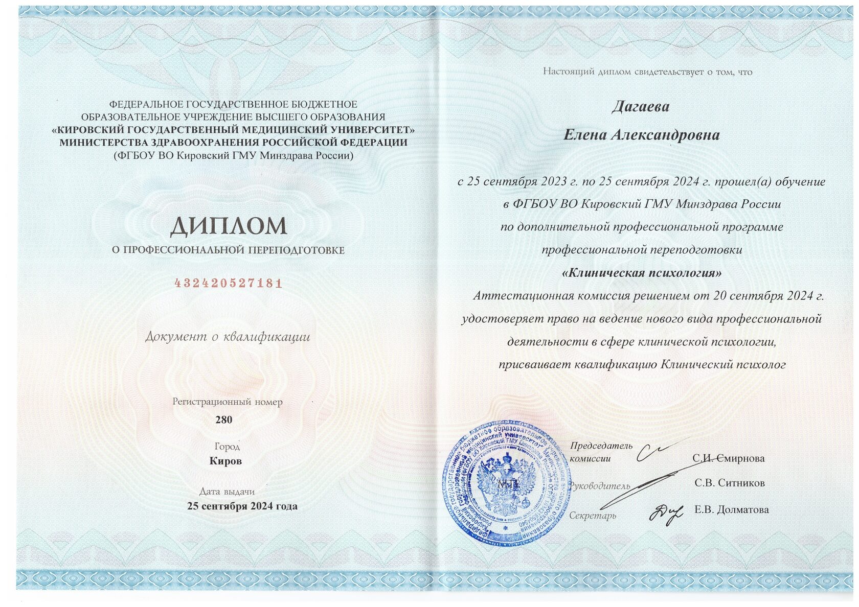2024 (ноябрь) - Кировский государственный медицинский университет (КГМУ), ДПО "Клиническая психология".