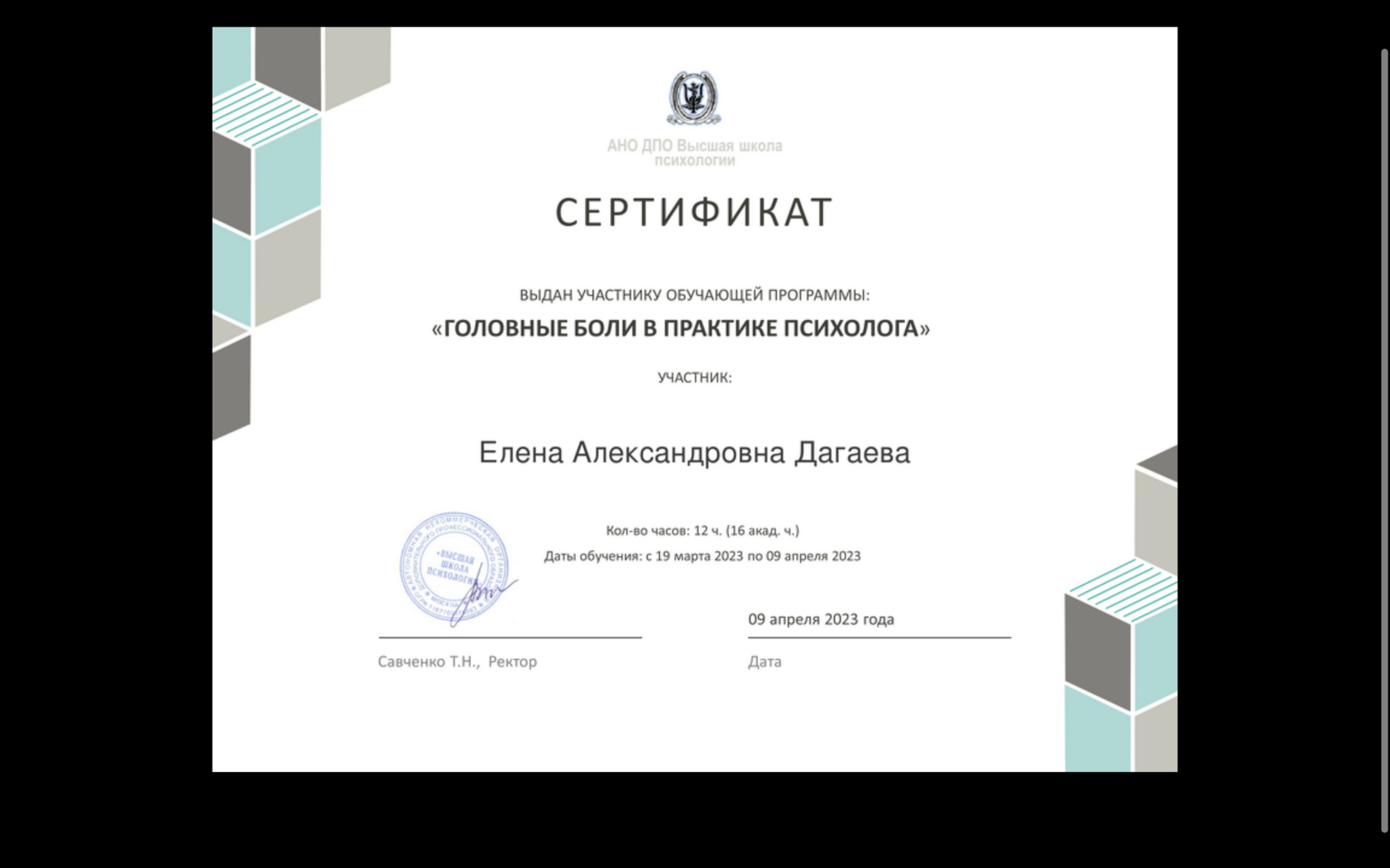 2023 г. – Головные боли в практике психолога. АНО ДПО «Высшая школа психологии», Ведущие – О. Шемятовская, Н. Прилепский, (Москва).